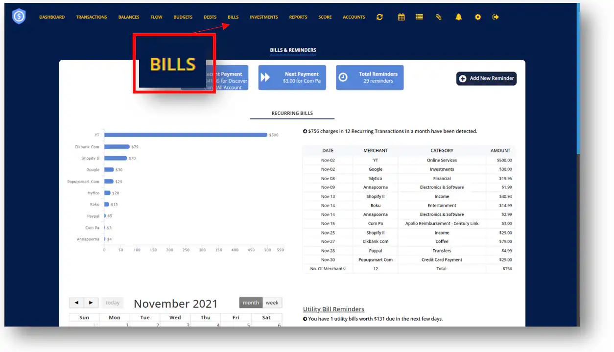 This field shows all of your bill payments. This allows you to know when your payments are due and makes it easier to pay them on time.