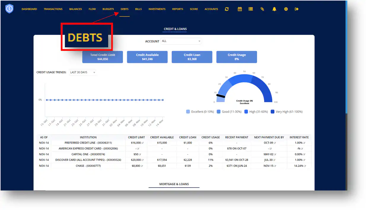 Ø Credit Usage- Credit card usage, or the percentage of available credit that you use per institution.