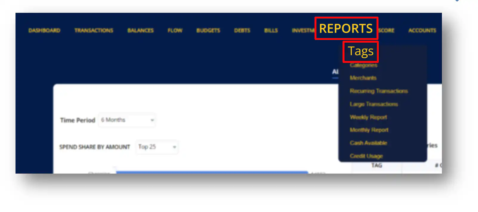 Tag Reports allows you to keep track of transactions connected with the tags you’ve created. It generates a report detailing how much money you’ve spent on each tag.